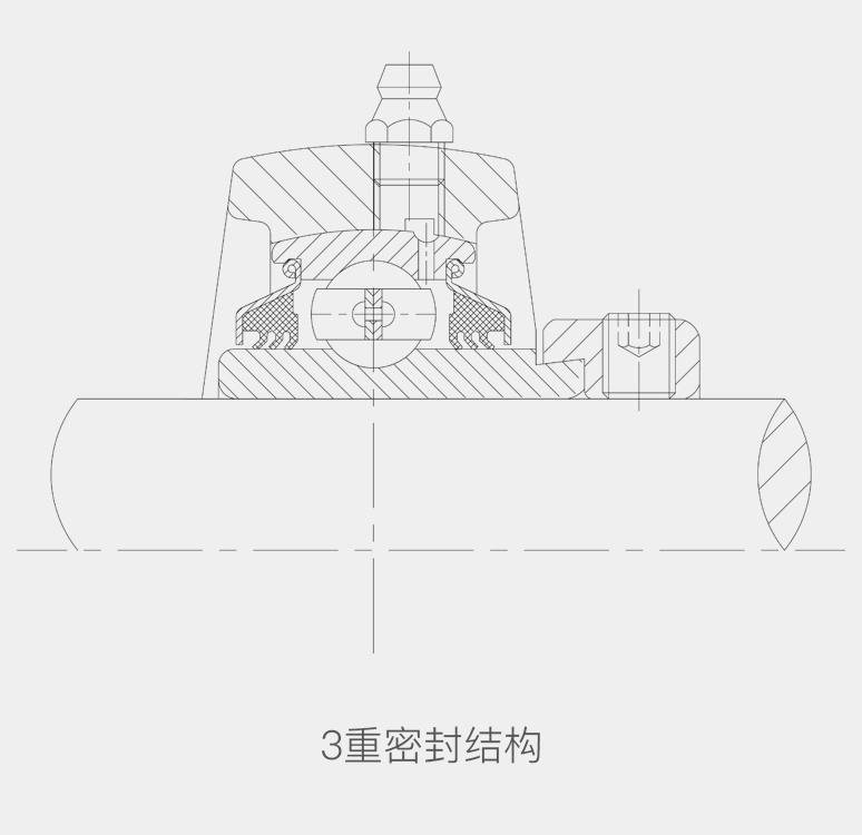 轴承外圈上的密封圈和内圈上的挡圈形成迷宫式密封,可 有效防止尘埃、水等侵入轴承内部。同时针对特别恶劣的场合,我们研发的三重密封圈的密封唇能以紧密贴合的紧迫力与轴承内圈接触,强力阻止外部尘埃、水等侵入轴承内部,延长轴承的使用寿命。